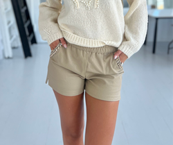 Virkelig lækre læder look shorts i en fin taupe farve, similisten på lommerne. Satin foer. Lommer, og elastik i livet.