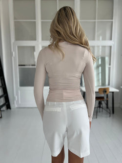 Beige bluse med smuk udskæring med knude detalje, er både stilfuld og komfortabel. Den flatterende V-udskæring fremhæver halsen og skuldrene, hvilket giver et elegant og feminint udtryk. Blusen er lavet af et blødt, strækbart materiale, der sikrer en perfekt pasform og behagelig bevægelse hele dagen. Den smukke beige farve gør den alsidig og let at kombinere med både nederdele og bukser, hvilket gør den til et ideelt valg til både hverdag og fest.. Søde knude detalje i siden