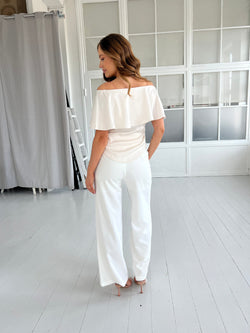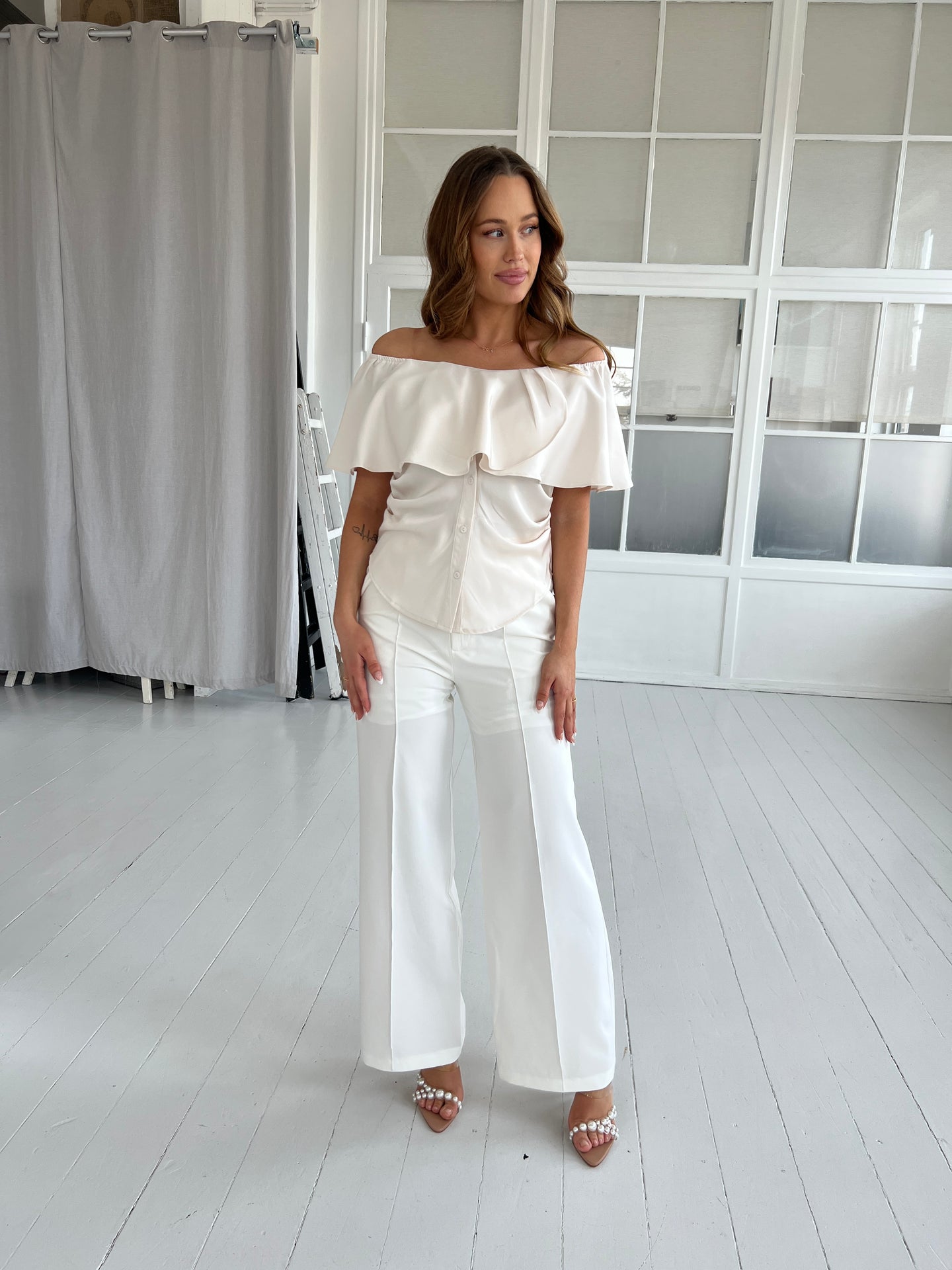 Beskrivelse: Virkelig fin og feminin satin bluse med stor smuk krave, lille elastik på begge skuldre så den både kan sidde oppe på skuldrene og den kan bruges off shoulder. Knappes foran. Detaljer i begge sidder
