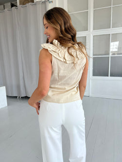 Beskrivelse: Virkelig fin og sommerlig bluse uden ærmer, dyb v-udskæring, og lille bindebånd. Hør stof - meget behageligt i varmen
