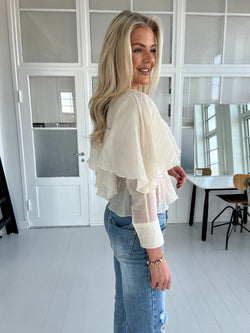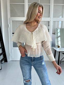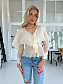 Elegant og lækker skjortebluse i en smuk cremefarve, designet med fine flæsedetaljer langs fronten og på ærmerne. Skjorten har en dyb udskæring på ryggen, lukkes med knapper og er let transparent for et feminint og sofistikeret udtryk.