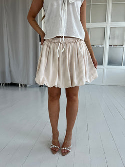 Beskrivelse: Denne søde nederdel med ballon effekt er lavet med klassiske beige og hvide striber. Nederdelen har elastik og flæsekant i livet samt bindebånd. I nederdelen er der indsyet undershort så den ikke kryber op.