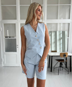 Virkelig lækker, trendy og meget anvendelige pastel blå shorts. perfekt pasform og med stretch i stoffet, lommer og læg foran, pynte baglommer, bæltestropper.