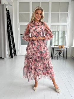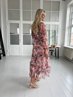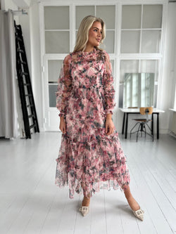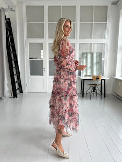 Virkelig smuk rosa lang chiffon kjole i et smukt rosa blomser print, mange flotte detaljer. Underkjole