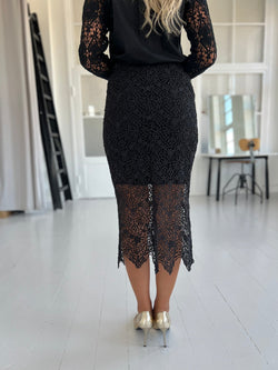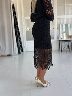 Smukkeste sorte blonde nederdel med underskørt til knæene, slids bag på og elastik i livet.