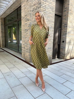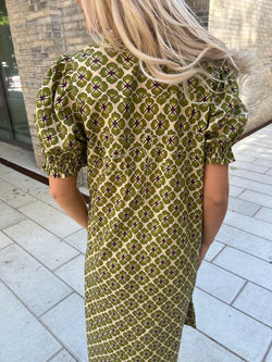 Her får du den fineste kaftan, i efterårets musthave. Kjolen er med knapper foran i den smukkeste guld farve. Korte ærmer med elastik og lille puf. lommer på begge sider. Dette er en oversize model og skal sidde løst. Stor påsyet guldsmed på ryggen