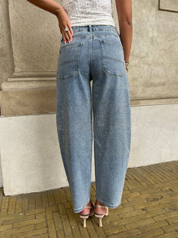 Super fede ballon jeans. Passer til enhver styling. De lukkes med knap og lynlås, stræk i bukserne. Bukserne har lommer bagpå Bukserne er normale i str. masser af små gennemsigtige rhinsten henover midten både foran og bagpå. Må gerne være lettere oversize og hænge lidt.