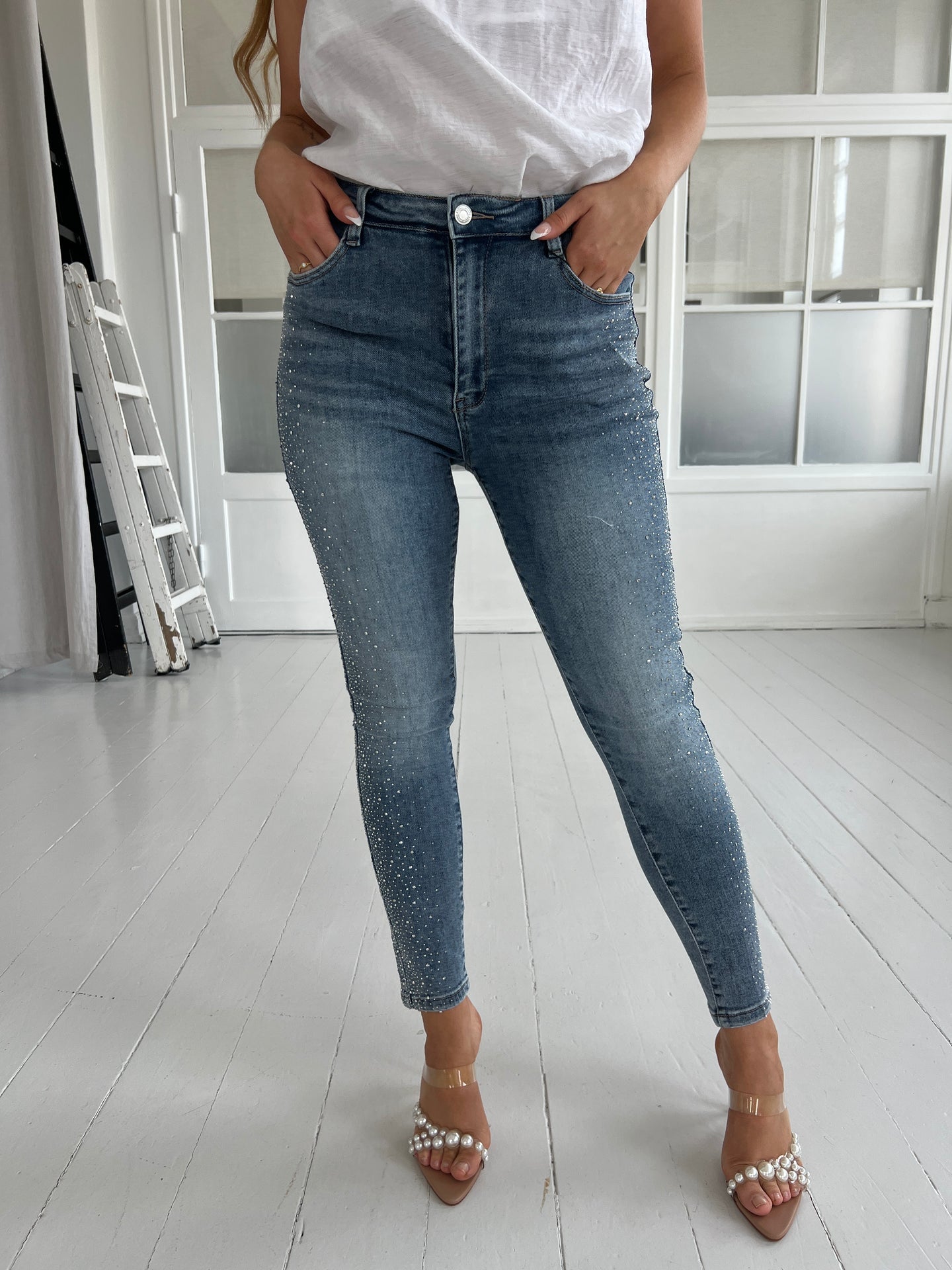 Super fede slim fit jeans. Passer til enhver styling. De lukkes med knap og lynlås, stræk i bukserne. Bukserne har lommer bagpå Bukserne er normale i str. masser af små rhinsten på siderne. Sidder godt til