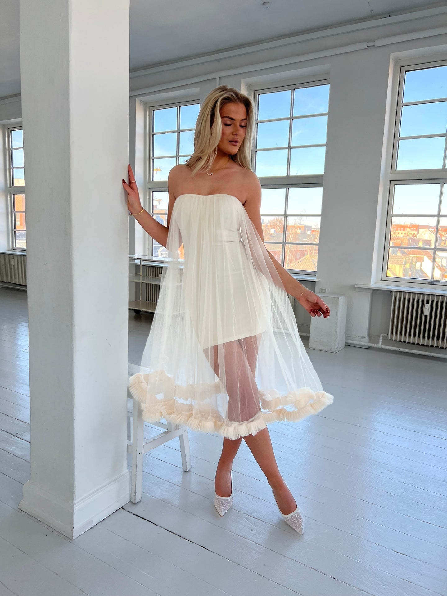 Beskrivelse: Smuk stropløse kjole i cream, har en tætsiddende underkjole og et luftigt lag af tyl. Den elastiske overkant sikrer en behagelig pasform, mens de rynkede flæser langs kanten tilføjer et romantisk touch. Perfekt til både fest og hverdagsbrug for et feminint og elegant look. Har silikonekant øverst så den ikke falder ned