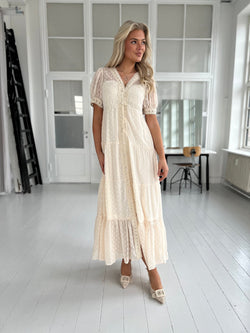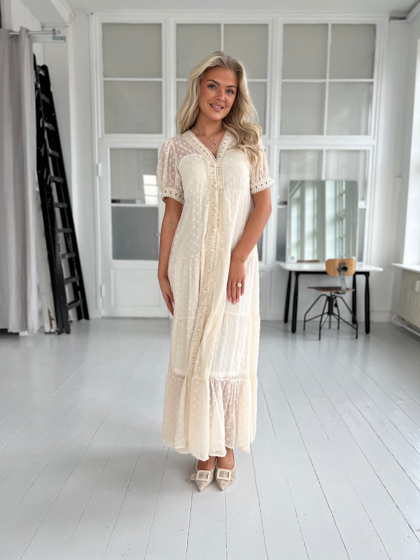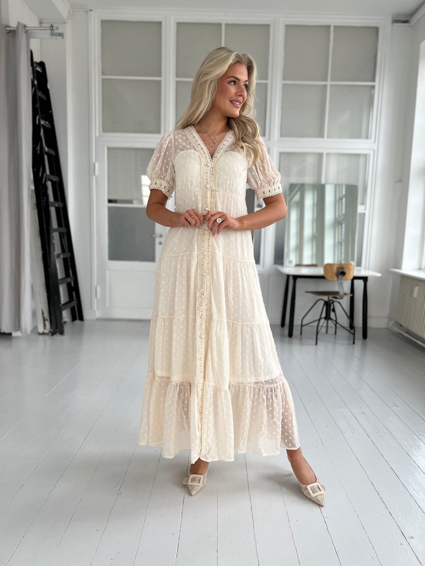 En romantisk cremefarvet maxikjole med broderede prikker, blondekanter og lette lag. Perfekt til sommer og særlige anledninger. Lukkes med knapper foran.