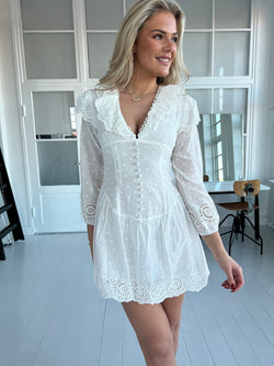 Smuk kort hvid kjoler med mange fine detaljer. Meget smuk udskæring foran hvor den knappes lange ærmer Normal i str. Underskørt.