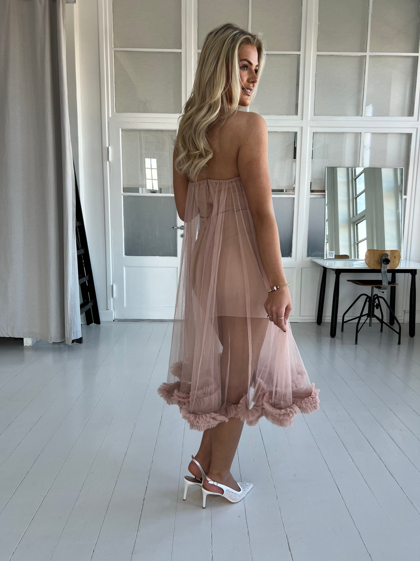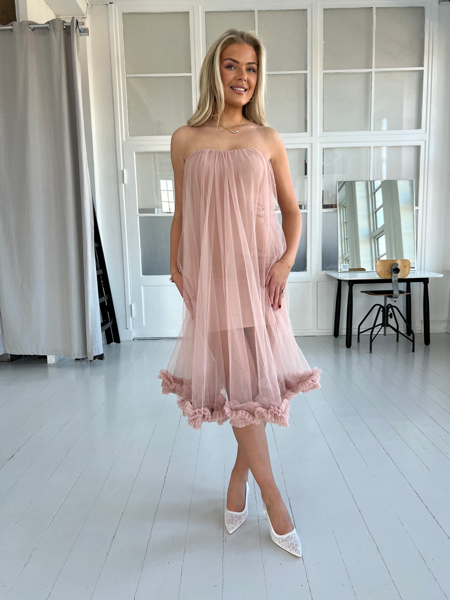 Beskrivelse: Smuk stropløse kjole i blød rosa har en tætsiddende underkjole og et luftigt lag af tyl. Den elastiske overkant sikrer en behagelig pasform, mens de rynkede flæser langs kanten tilføjer et romantisk touch. Perfekt til både fest og hverdagsbrug for et feminint og elegant look. Har silikonekant øverst så den ikke falder ned